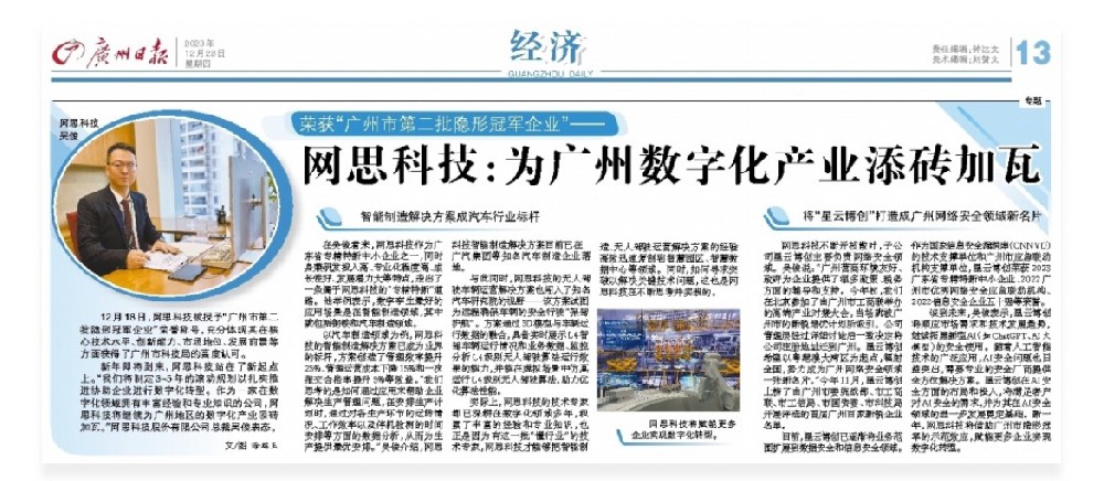 12月28日,《广州日报》经济板块报道了网思科技的专题访问。总裁吴俊先生代表网思科技接受采访,向读者分享了网思科技的智慧解决方案以及子公司星云博创未来的发展规划。图为《广州日报》12月28日网思科技专访版面荣获“广州市第二批隐形冠军企业”——网思科技:为广州地区的数字化产业添砖加瓦12月18日,网思科技被授予“